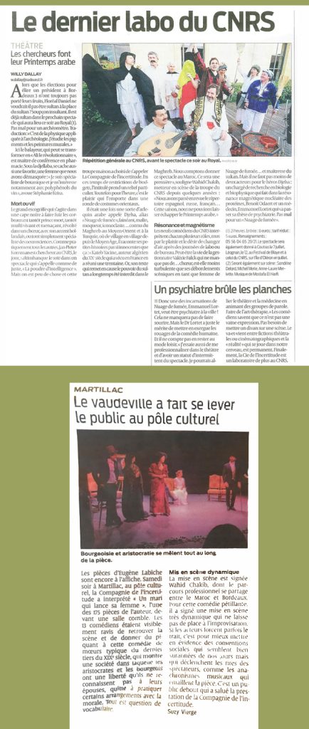 - Martillac : Le vaudeville a fait se lever le public au pôle culturel, Suzy Vierge, Sud-Ouest, 23 novembre 2021